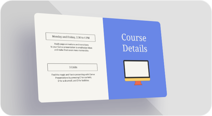 Monday and Friday, 2:30 to 4 PM Course Apply page animations and transitions to your Canva presentation to emphasize ideas Details and make them even more memorable. 3 Units Find the magic and fun in presenting with Canva Presentations by pressing C for confetti, D for a drumroll, and O for bubbles.