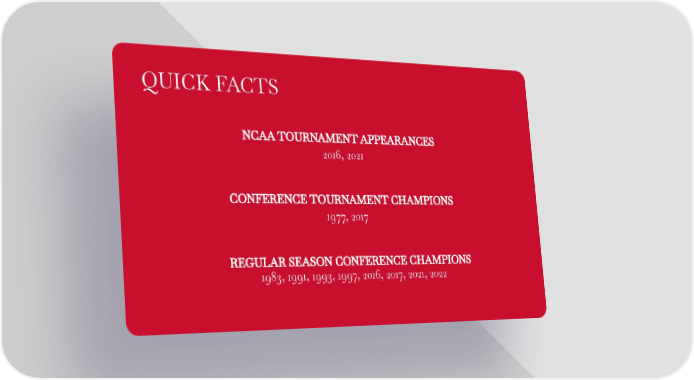QUICK FACTS NCAA TOURNAMENT APPEARANCES 2016, 2021 CONFERENCE TOURNAMENT CHAMPIONS 1977, 2017 REGULAR SEASON CONFERENCE CHAMPIONS 1983, 1991, 1993, 1997, 2016, 2017, 2021, 2022
