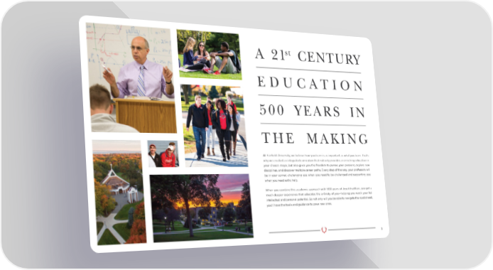 st A 21 CENTURY EDUCATION 500 YEARS IN THE MAKING At Fairfield University, we believe how you learn is as important as what you learn. That’s why we created an integrated curriculum that not only provides an enriching education in your chosen major, but also gives you the freedom to pursue your passions, explore new disciplines, and discover multiple career paths. Every step of the way, your professors will be in your corner, challenging you when you need to be challenged and supporting you when you need extra help. When you combine this academic approach with 500 years of Jesuit tradition, you get a much deeper experience that educates the entirety of you—helping you reach your full intellectual and personal potential. So not only will you be able to navigate the road ahead, you’ll have the tools and guidance to pave new ones. 3