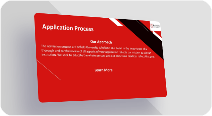 Application Process FR Our Approach The admission process at Fairfield University is holistic. Our belief in the importance of a thorough and careful review of all aspects of your application reflects our mission as a Jesuit institution. We seek to educate the whole person, and our admission practices reflect that goal. Learn More