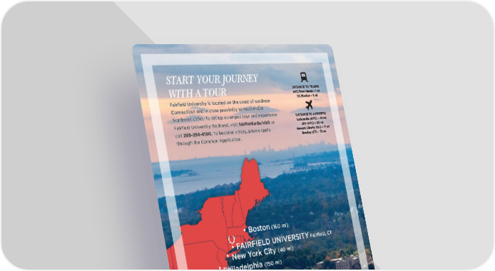 SSTTARART YOUR JOURNEYT YOUR JOURNEY DISDISTTANCE TANCE TO TRAINSO TRAINS:: WWITH ITH AA TO TOURUR NYNYC/NeC/New Haw Havven – 1 mien – 1 mi FFairifeld Univairifeld University is locaersity is locatted on the ced on the coasoast of southernt of southern DC/BosDC/Bostton – 5 mion – 5 mi CConnecticut and in close pronnecticut and in close prooximity tximity to moso most majort major NortheasNortheast cities. Tt cities. To set up a campus to set up a campus tour and eour and experiencxperiencee DISDISTTANCE TANCE TO AIRPORO AIRPORTTS:S: FFairifeld Univairifeld University ifrsersity ifrsthand, visitthand, visit fairifeld.edu/visit oror LaGuarLaGuardia (NYdia (NYC) – 4C) – 49 mi9 mi callcall 203-254-4100. TTo beco become a Some a Stag, please applytag, please apply JFK (NYJFK (NYC) – 60 miC) – 60 mi NeNewwark Liberty (NJ) – 7ark Liberty (NJ) – 71 mi1 mi thrthrough the Cough the Common Applicaommon Application.tion. BrBradleadley (y (CT) – 7CT) – 73 mi3 mi • Boston (160 mi) • FAIRFIELD UNIVERSITY Fairifeld, CT • New York City (40 mi) • Philadelphia (150 mi) • Washington, D.C. (280 mi) fairifeld. edu @FairifeldAdmission @FairifeldUniversity @FairifeldU
