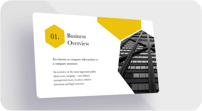 Business 01. Overview Also known as company information or a company summary An overview of the most important points about your company—your history, management team, location, mission statement and legal structure.