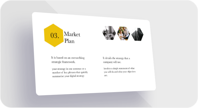 Market 03. Plan It is based on an overarching It details the strategy that a strategic framework. company will use. your strategy in one sentence or a involves a simple statement of what number of key phrases that quickly you will do and what your objectives summarize your digital strategy are.
