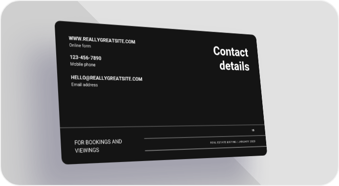 WWW.REALLYGREATSITE.COM Online form Contact 123-456-7890 details Mobile phone [email protected] Email address 15 FOR BOOKINGS AND REAL ESTATE LISTING | JANUARY 2020 VIEWINGS