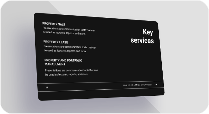 PROPERTY SALE Presentations are communication tools that can Key be used as lectures, reports, and more. services PROPERTY LEASE Presentations are communication tools that can be used as lectures, reports, and more. PROPERTY AND PORTFOLIO MANAGEMENT Presentations are communication tools that can be used as lectures, reports, and more. 03 REAL ESTATE LISTING | JANUARY 2020
