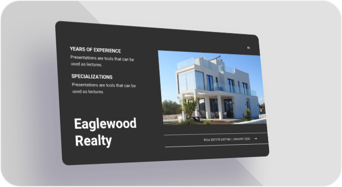 02 YEARS OF EXPERIENCE Presentations are tools that can be used as lectures. SPECIALIZATIONS Presentations are tools that can be used as lectures. Eaglewood REAL ESTATE LISTING | JANUARY 2020 Realty
