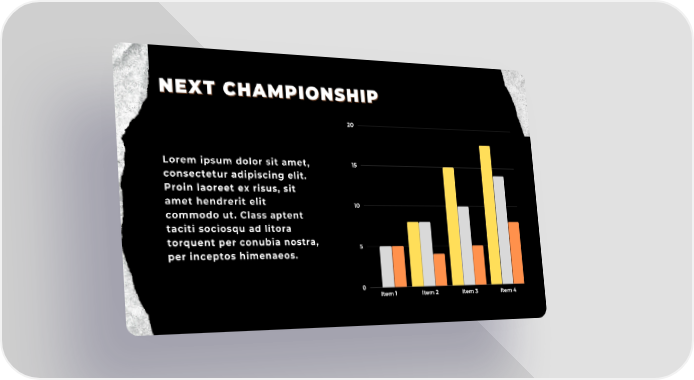 NEXT CHAMPIONSHIP NEXT CHAMPIONSHIP 20 Lorem ipsum dolor sit amet, 15 consectetur adipiscing elit. Proin laoreet ex risus, sit amet hendrerit elit 10 commodo ut. Class aptent taciti sociosqu ad litora torquent per conubia nostra, 5 per inceptos himenaeos. 0 Item 1 Item 2 Item 3 Item 4
