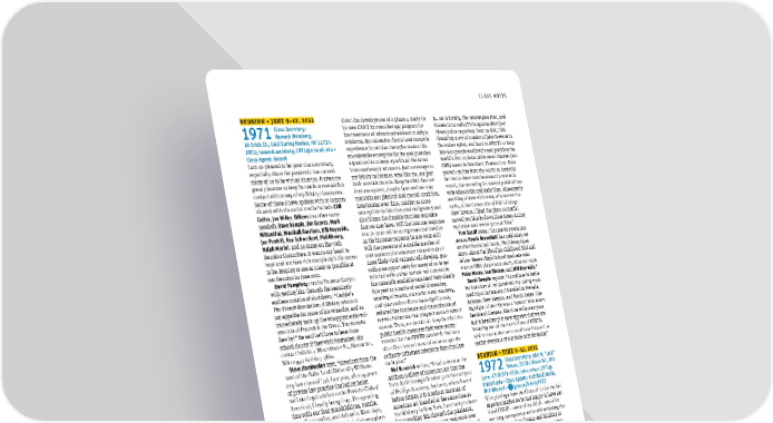 FALL 2021 51 CLASS NOTES REUNION • JUNE 9–12, 2022 1971 Class Secretary: Howard Weinberg, 16 Erick Ct., Cold Spring Harbor, NY 11724- 1901; [email protected] • Class Agent: Vacant I am so pleased to be your class secretary, especially since the pandemic has caused many of us to be virtual shut-ins. It gives me great pleasure to keep in touch or reestablish contact with many of my Trinity classmates. Some of those I have spoken with or commu - nicated with via social media include Cliff Cutler , Jon Miller , DiBens (no other name needed), Dave Sample , Jim Graves , Mark Mittenthal , Marshall Garrison , Bill Reynolds , Joe Pratt II , Ken Schweikert , Phil Khoury , Ralph Morini , and so many on the 50th Reunion Committee. It warms my heart to hear and see how rich everybody’s life seems to be. Hoping to see as many as possible at our Reunion in June 2022. David Pumphrey credits Thomas Carlyle with getting him through the seemingly endless months of shutdown: “Carlyle’s The French Revolution: A History whetted my appetite for more of his wizardry, and so immediately took up the whopping eight-vol - ume bio of Frederick the Great. The months flew by!” He said he’d love to hear from school chums if they visit Nantucket. His contact info is: 4 Westminster St., Nantucket, MA 02554; 646-647-4860. Steve Jianakoplos says, “Greetings from the land of the Saint Louis University Billikens (my law class of ’74). Last year, after 45 years of private law practice (including being national legal adviser to the Porsche Club of America), I finally hung it up. I’m spending time with our four grandchildren, Natalie, Clay, Constantine, and Aristotle. Most days, I also discharge the ‘Lisa list’ of chores given to me by my lovely bride of 40 years. I’m in regular contact with Rick Mazzuto and Lou Slocum . Rick lives in Modesto, California, but we manage to see each other two or three times a year. Slocum has a lady friend in the village of Hana on Maui, Hawaii. He’s been commuting between there and Vista, California. Other than the general aches and pains of getting old, things are good, and I send best wishes to all my classmates.” Philip S. Khoury received an honorary degree from Trinity at the May 21, 2021, Commencement on campus. He reports, “It was a gorgeous sunny day, unlike our class’s Commencement exercises 50 years ago when it rained.” Michael E. Trigg , M.D., writes, “I am one of those who has the pleasure of living in Florida and thus can enjoy warm or warmer weather year-round, but I still require some educational stimulation. Currently on a contract with Janssen Pharmaceuticals to direct the development of a phase 4 study for its new CAR-T immunotherapy program for the treatment of refractory/resistant multiple myeloma. My extensive clinical and research experience in cellular therapies makes this an enjoyable enterprise for me and provides a good outlet to keep up with all the latest immunotherapy advances. Just a message to my Trinity colleagues, who like me, are past their seventh decade. Keep in mind that our immune system, despite how well we may maintain our physical and mental condition, deteriorates over time, making us more susceptible to infection and malignancy and also blunts the durable immune response that we may have. Will the immune response in a 70-year-old be as vigorous and durable as the immune response in a 20-year-old? Will the presence of a sizable number of anti-vaxxers (for whatever reason) make it more likely viral variants will develop, pro - viding an opportunity for many of us to get infected with a viral variant not covered in the currently available vaccines? Very clearly this past 12 months of social distancing, wearing of masks, excessive hand washing, and quarantine efforts have significantly reduced the incidence and transmission of normal influenza that plagues us each winter season. Thus, we should all keep in mind the public health measures that were recom- mended for the COVID pandemic that as a side effect helped most of us to escape the ordinary influenza infections that circulate each year.” Mel Kendrick writes, “I had a show at the Addison Gallery of American Art that ran from April through October 3 on the campus of Phillips Academy, Andover, where I went before Trinity. It is a serious museum of American art founded at the same time as the Whitney in New York. I am lucky to have been working this through the pandemic, and it is amazing to see my own work over the last 50 years or so. There is also a Rizzoli coffee table book with the same title, Mel Kendrick: Seeing Things in Things . My family is doing well. I have lived in downtown Manhattan since graduation! My wife, Mary Salter ’73, and I have three great kids out in the world doing very different things, a dip - lomat in the State Department until Trump, a filmmaker, and a social worker.” Jon Miller sends a picture of an old Bantam with his grandson Bantam-to-be at the Georgia state track meet! Bill LaPlante II , five-time Emmy winner for ABC/CBS-TV, is “doing my final edit on two tomes, one verisimilitude of fifth-generation seafaring family turned oyster farmers on an island of 80 hearty souls in the frigid North Atlantic Ocean, the other my family memoir from working the Simsbury, Connecticut, tobacco fields beside Dr. Martin Luther King Jr., on to Trinity, The Washington Post , and Connecticut radio/TV/magazine/ Hartford Times police reporting. Next to ABC, CBS (breaking story of murder of John Lennon in December 1980), and back to ABC-TV to help hire 600 people worldwide and premiere the world’s first 24-hour cable news channel (not CNN) based in Stamford, Connecticut. Next project: sailing from the Arctic to Antarctic for two to three months aboard a research vessel, documenting for several publications with video/stills and daily blog. Also eagerly awaiting a brew with many of you over the rocks, at the former site of Phil’s College View T