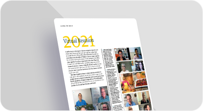 ALONG THE WALK Virtual Reunion 2021 A gathering in cyberspace! Classes originally slated to cel- 4. Make Ahead Summer ebrate their Reunions last year got together online June Salads and Side Dishes 2 10–13 for Trinity’s Virtual Reunion Weekend. Alumni rep- for Picnics, Potlucks, and BBQs: A Cooking resenting seven decades of Trinity’s history came together Class for the Class of for 20 events during the course of the weekend, including 1980 with Lee Clayton class-speciifc functions organized by Reunion Planning Roper ’80. Lee Clayton Roper ’80, cooking Committees and All-Reunion speaking programs and on- instructor and author demand contests. Classes originally slated to gather in 2021 of the award-winning also were invited to join in on the fun in advance of plan- cookbook series A 3 Well-Seasoned Kitchen, ning for joint in-person festivities with the classes celebrat- and one Roper’s dishes ing in June 2022. 5. A Shifting Admissions Bantams logged on from 27 states and six countries to Landscape: Current take part in the weekend, which featured the expertise of Trends and Future Issues alumni across numerous industries and current and retired in American Higher Education. Clockwise faculty members. Alumni competed in a Virtual Reunion from top left: Lee 4 5K and Virtual Reunion Trivia Contest, connected with one Coffin ’85, vice provost another in virtual class lounges, and more! and dean of admissions and financial aid at Dartmouth College; Ann Newman Selvitelli ’91, director of college 1 counseling and leadership at Suffield Academy; Adrienne Amador Oddi, Trinity’s dean of admissions and financial aid; and Zee Santiago ’09, college and career planning 5 manager in the Office of Postsecondary Readiness in the NYC Department of Education 6. A View from ’Neath the Elms: Reflecting on the Year and Envisioning the Future. Clockwise from top left: Mitchell Polin ’96, associate dean for curriculum and associate professor of theater and dance; Drew 1. Making a Mark: 2. The Art and Science 3. Fighting for the Galbraith, director of Bantam Experts on of Memory: How Do Underdog: A athletics and chair of Building a Brand. We Remember? with Conversation with physical education; Clockwise from top left: Joanne Berger-Sweeney, Civil Rights and Joe DiChristina, vice Jess Sims ’10, Peloton president and Trinity Employment Attorney president for student 6 instructor, in-arena College professor Lisa Banks ’90. Adrienne success and enrollment co-host of the New York of neuroscience. “Renny” Fulco, director management; and Joanne Liberty, and Reebok Joanne Berger- of Trinity’s Public Policy Berger-Sweeney P’22, athlete; Chris Hatch ’80, Sweeney P’22 and and Law Program and president and Trinity CEO of Food Banks Arko Ghosh ’04, associate professor of College professor of Canada; Paul Sullivan assistant professor in legal and policy studies, neuroscience ’95, New York Times cognitive psychology and Lisa Banks ’90 ↗ columnist and host of the at Leiden University View recordings of the Trinity podcast Beyond and co-founder of All-Reunion presenta- MARINELLI the Summit; and Bryant QuantActions tions at commons. McBride ’88, P’20, CEO JOHN of Burst and producer of trincoll.edu/Reporter. ) the acclaimed film Willie GHT RI ( : O T PHO 12 THE TRINITY REPORTER