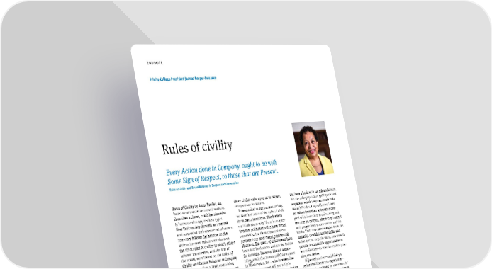 ENDNOTE Trinity College President Joanne Berger-Sweeney Rules of civility Every Action done in Company, ought to be with Some Sign of Respect, to those that are Present. Rules of Civility and Decent Behavior in Company and Conversation Rules of Civility by Amor Towles, an clear: civility calls upon us to respect not have a book with 110 rules of civility, investment executive turned novelist, everyone we encounter. but the college provides guideposts and describes a clever, brash heroine who It seems that in our current society , a space in which they can create their is introduced to upper-class 1930s we have lost some of the rules of ci- vil own civil rules. They will do so based New York society through an unusual ity in our interactions. This leads to on values from their upbringing cou- and somewhat unfortunate set of events. me think about why. There’s no ques- pled with those they acquire living and The story follows the heroine as she tion that political divides have torn at learning on campus, where they interact deifnes her own values and observes our civility, but these circumstances with people from across society and the the strict rules of civility to which others preceded our most recent presidential world. Their time here will give them the adhere. These rules, and the title of elections. The seeds of divisiveness have empathy, careful listening skills, and value system to guide them, and we will the novel, were based on the Rules of been laid for decades and are the fodder Civility and Decent Behavior in Company for incivility. Recently, I heard a trou- provide innumerable opportunities to and Conversation, a book containing bling prediction from a political watcher use their rules—to practice, revise, prac- 110 principles that originated from a set in Washington, D.C., who foresees that tice, and revise. of guidelines authored by French Jesuits every four years we will see a lfip in Higher education—and Trinity’s in the late 16th century. The guidelines political power, that we will be swinging residential liberal arts experience— were popularized when our country’s back and forth regularly, because each provides the pathway for our students’ ifrst president, George Washington, a side will block, with a complete lack of transformative educational experience, teenager at the time, handwrote a copy civility, any progress the other side tries which evolves from simply what students of them. It is said that Washington’s to make. We all can play a role in chan-g do to what they live and who they are. ing this problematic prediction; we can That journey fosters not only their int-el actions helped him internalize the ideas, albeit imperfectly, in turn molding his be a part of a more civil future. lectual development but also the social character. While it should be said that My thoughts go back to a young and moral growth that can contribute Washington didn’t practice all of what George Washington, who was trying to to a more civil society. As an institu- he learned, I was struck by rule number learn these rules of civility, not too far tion of higher education, we welcome one—the excerpt at the top of this letter— removed from the age of Trinity’s enter- this extraordinary responsibility and privilege. And every single person who and its relevance for our Trinity commu- ing students. It’s at this time of life that nity today. our students are exploring the rules of beneifts—or beneifted—from a Trinity This rule guides us to show respect social connections and interactions and College education has the ability and for one another—no matter who or trying to discern how those rules will responsibility to share the fruits of their what is involved. It doesn’t dictate guide them and shape their own values. experiences here with others. We are that we should respect someone onl y As I told our newest ifrst-years when they now ambassadors of the rules of civility; if that person looks or sounds like us took their places on the Main Quad at we can model how to interact with others or agrees with our opinion; no, it is September’s Convocation, Trinity may with respect. 80 THE TRINITY REPORTER