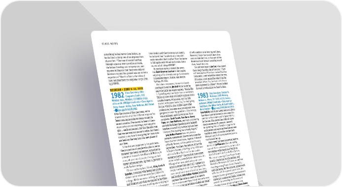 56 THE TRINITY REPORTER CLASS NOTES something he had never done before, so he decided to jump out of an airplane from 18,000 feet. “The roar of sound hurtling through space at over 120 miles an hour, the below-freezing-cold temperature, and my eyes telling me that there was only air between me and the ground was an extreme experience.” Here’s a link to the video of Tom jumping from the airplane: https://bit. ly/3fiTFNS. REUNION • JUNE 9–12, 2022 1982 Class Secretary: Ellin Carpenter Smith, 932 Windsor Ave., Windsor, CT 06095-3422; [email protected] • Class Agents: Patty Hooper Kelley, Tom Mathews, Bill Talbot • /groups/TrinColl1982 Over the course of this past year, we’ve shared stories of all the different ways we’ve been commemorating 60 years young. In recent months, I’ve started to hear of class - mates who are entertaining a new opportu - nity ... early retirement. My first thought was that we are way too young to retire. But then I started to see how it was going for those who are leading the way into this new phase of our lives. I checked and apparently for years now, the proportion of people who plan to retire younger has been increasing. According to consumer research firm Hearts & Wallets, in 2020, 18 percent of people cited 59 as their target retirement age, up from 11 percent in 2018. So here we go. I’ll start with my best friend, Vicky Lenkeit Scanlon , a woman who began her profes - sional career when we were just juniors in college. While we were chilling on the quad and figuring out what we wanted to be when we grew up, she was working and studying to become an actuary at the Travelers Insurance Company. She continued on that path until motherhood took precedence. Later she put her talents to work at Loomis Chaffee School, where her husband headed up the English Department. She and Jeff have made the momentous decision to seize the opportunity to retire early to their charming home on the Cape. I will miss living 12 houses away here in Windsor, but I admire her sense of adven- ture. Looking forward to seeing what’s next for her. Quite sure it will be wonderful. Next, we have Tom Mathews . His update indicated that he already enjoys retirement and working in a wine shop for his retire- ment gig. “Hope I can get back to teaching classes again soon in a post-COVID world. For other excitement, I am planning to take my mother to Italy to celebrate her 80th birthday.” After the pandemic prompted three successive postponements, he hopes the fourth time is the charm. Following the graduation of his twins from Wake Forest (cum laude) and Elon (summa cum laude), he declared that “academically they obvi- ously take after their mother! Now the house is full again until virtual work ends. Come on, end of all things COVID!” In previous notes, I shared the news that Barb Sherman Levison is thoroughly enjoying a life of tennis and golf alternately in Kennebunkport, Maine, and Bonita Springs, Florida. For other classmates, the world of work continues to excite. Jim Dod wrote to say he and wife Cathy are empty nesters. “Kinda like it. Spending way too much time on weekends fixing up a 100-year-old family summer home in Lake Geneva, Wisconsin, but I’m fully stocked with power tools. So, I’ve that going for me, which is nice. Unlike many other professions, business as a psychologist was gangbusters over the pandemic. Teletherapy was a godsend, and I’m worn out. Not a complaint. Scott Cassie , Tom Tarca , Kenny Papa , and Tom Mathews , and I are celebrating our 60th birthdays (pandemically belated) together on a golf trip to Palm Springs later this year. The razzing has already begun.” Judy Bolton-Fasman has completed a personal masterwork. She wrote to share the news that her debut book, Asylum: A Memoir of Family Secrets , will be published in early September. “And yes, the Asylum of the title is Asylum Avenue, referring to my childhood address in West Hartford. Let the double entendres begin!” You can find more essays on her website, www.judyboltonfasman.com. I Googled her new publication and came across a review that says it all. “ Asylum is a deeply moving memoir that investigates the ever-complicated knot of familial love, loss, and longing. Judy Bolton-Fasman beautifully captures that urge so many of us have to better understand those loved ones who were close to us yet nonetheless eluded our grasp.” To wrap up these notes, our class pres - ident, Scott Cassie , offers an invitation to us all. “As always, I hope these Class Notes find you, families, and friends well. I’ve got nothing pithy to share for this edition, though I could always go on about my kids. I’ll save that for Reunion. Which leads me to the point of my note. I sincerely hope to see you at our upcoming 40th Reunion come June 9–12, 2022. To be honest, the save-the- date email back in April from the Alumni Office was quite a shock. ‘40? How is that possible?’ I asked my dog, who has been my constant work-from-home assistant for the last 15 months. But it’s time. Time to see one another again. Time to remember and also time to celebrate in those small conversations and with the larger planned events. We all have done so much, large and small, since each touched ‘the Book’ at graduation on that soggy day in May 1982. I am sure we all will continue to be busy up until June. However, I hope that you will have time, and can take the time, to be a part of this Reunion. I look forward to seeing you all then, ’neath the elms. The last word goes to Jim Dod , who shared these deep thoughts about Reunion. “I hav - en’t been back to Trin since the last Reunion I attended. I can’t remember when that was. Of course, I can’t remember what I had for breakfast either. Oh, the brain cells I must have destroyed in college!” We are looking forward to welcoming you back in June. 1983 Class Secretary: Thomas M. McKeown, 2400 Winding Hollow Ln., Plano, TX 73093-4109