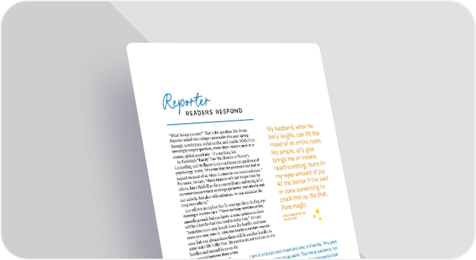 Reporter readers respond “What brings you joy?” That’s the question The Trinity My husband, when he Reporter asked the college community this past spring belly laughs, can lift the through newsletters, social media, and emails. While it’s a seemingly simple question, these days—amid a once-in-a- mood of an entire room. century global pandemic—it’s anything but. His simple, silly glee As Randolph “Randy” Lee ’66, director of Trinity’s Counseling and Wellness Center and associate professor of brings me an insane, psychology, notes, “It’s clear that the pandemic has had an impact on most of us when it comes to our emotional state.” heart-bursting, tears-in- For some, he says, “these impacts will last longer than for my-eyes amount of joy. others, but I think if we focus on resilience and trying to let ourselves bounce back as things get better, realistically and All the better if I’ve said not naïvely, but also with optimism, we can minimize the or done something to long-term effects.” Lee offers a metaphor that he says speaks to ifnding joy: crack him up like that. running a hurdles race. “There are long stretches of lfat, smooth ground, but you know at some point soon there Pure magic. will be a hurdle that you need to jump over,” he says. CARLA BOECKLIN ’01 “Sometimes you may knock down the hurdle, and some- Park City, Utah times you may clear it. Atfer the hurdle is another smooth area, but you always know there will be another hurdle. In some ways life is like that. We need to try not to focus on the hurdles and instead focus on the lfat ground between them when we can be more at peace.” I am a critical care medicine doc in Florida. This past So what “lfat, smooth ground” year has been brutal at work. Too many patients, not helped those in the Trinity com- munity get through the trying enough beds or nurses, not enough treatments that times of the COVID-19 pandemic work. Too many deaths. My little bursts of joy have been and its fallout? What is it that found through night sky watching and my pets. I love to brought joy? Read on to ifnd out. be outside at night in Florida. It’s cooler for one, fewer people are out, better time to walk my dog. We live in a OCK As an aging retiree, I now suburb, so the night sky is pretty visible, and Florida is T reside in an apartment, which has a picture window lfat so you get the whole sky to see. It really is uplifting. SHUTTERS facing east. I watch the I have seen many shooting stars, moonrises, and the / dawn now with joy and ASH close alignment of Mars and Jupiter last year. We have a AD marvel at the changing BIB big dog and two cats. They are a constant source of love : cloud patterns that make ONS each dawn individual. TI and laughs. I cannot imagine living without them! TRA US RICHARD FERRARO ’55 ILL Dover, New Hampshire SARAH A. NEILLY• Melbourne, Flor ’81 ida FALL 2021 29