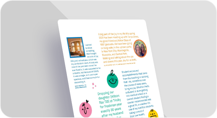 A big part of the joy in my life this spring 2021 has been meeting up with Tanya Jones, my good friend and fellow Class of I wanted 1997 graduate. We have been going to share on long walks in the uptown parks something in New York City: Morningside, that brought Riverside, and Central Park. me a lot of joy this past school year, which was Walking and talking about the ups my Jarvis dorm room. It truly was and downs this year. Joy for us both. one of the prettiest rooms I’ve ALI MCCARTNEY AUTH w’9ith T7, anya Jones ’97 • New York, New York ever lived in. It was supposed to be a double, but because of COVID, it was a single, so it was super Student and alumni spacious, and I had so much fun accomplishments that come decorating it. from the teaching or advising KATIE RUSSELL ’ 22 Gratfon, Massachusetts that I do, sometimes over the course of many years, Dropping our bring me joy. Whether that’s daughter [Allison a student or alum getting Rau ’23] at Trinity into medical school or a current student ifnding a for freshman year course I recommended was exactly 30 years a great ift, or whether it’s after my husband one of my nutrition students For me, and I arrived as taking control of walks outside their own health, with my freshmen ourselves. knowing that I DANA MEACHEN RAU ’9w3ith Chr, is Rau ’93 played a positive toddlers and Burlington, Connecticut role in their connecting development and with my research seeing their pride in their students on Zoom accomplishment—that brings brought me joy me great joy! during these ALISON DRAPER unusual times. Director, Center for Interdisciplinary Science EMILY DERBYSHIRE ’02 Durham, North Carolina 30 THE TRINITY REPORTER