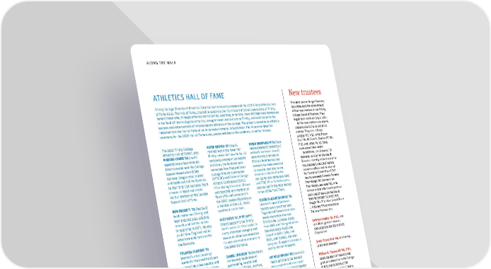 ALONG THE WALK ATHLETICS HALL OF FAME New trustees Trinity College Director of Athletics Drew Galbraith recently announced the 2021 Trinity Athletics Hall President Joanne Berger-Sweeney of Fame class. The Hall of Fame, created to celebrate the rich history of athletic excellence at Trinity, has announced the appointment honors those who, through athletics participation, coaching, or service, have distinguished themselves of four new trustees to the Trinity in the ifeld of intercollegiate athletics, brought honor and acclaim to Trinity, and contributed to the College Board of Trustees. They success and advancement of intercollegiate athletics at the college. The group is slated to be oiffcially began their terms on July 1, 2021. inducted into the Hall of Fame at an in-person ceremony in September. The in-person induction All the new trustees are alumni, ceremony for the 2020 Hall of Fame class, postponed due to the pandemic, is set for October. and one also is the parent of an alumna. They are: LaTanya Langley ’97, H’17, Jamie Tracey The 2021 Trinity College PETER GRAVES ’07 (men’s ROBIN SHEPPARD M’76 (ifeld Szal ’06, William G. Thomas III ’86, Athletics Hall of Fame Class: rowing) was a top rower for hockey/women’s basketball/ P’20, and James Yu ’87. Read MARCUS COWIE ’00 (men’s Trinity crews that rose to No. 10 women’s lacrosse—coach/ more about them below. squash) was a four-time All- nationally among all collegiate administrator) served as In addition, Lisa Bisaccia ’78 American who won the College divisions; the Bantams won Trinity’s ifeld hockey and took over as chair of the board. Squash Association (CSA) numerous New England Small women’s lacrosse coach for Bisaccia, recently retired executive National Singles title in 1997 College Athletic Conference 25 seasons and later as an vice president and chief human and 1998 and led the Bantams (NESCAC) and Eastern College associate athletic director. resources oiffcer and member of to their ifrst CSA National Team Athletic Conference (ECAC) Her teams won numerous NIAC the Executive Committee of CVS crowns in 1999 and 2000. titles during his career. Graves and ECAC titles in both sports, Health, succeeds Cornelia Parsons He is a member of the College was selected as a member of and she led Trinity ifeld hockey Thornburgh ’80 (for more on Squash Hall of Fame. Team USA and competed in to two NCAA Final Fours. Thornburgh, see page 36), who the 2012 London Olympics as retired in June atfer seven years as RON DUCKETT ’74 (football) a member of the U.S. men’s CLAIRE SLAUGHTER JOYCE ’86 chair and 17 years on the board. holds numerous Trinity and quadruple sculls boat. (women’s squash/women’s Rhea Turteltaub ’82 and Craig New England pass-catching tennis) was a two-time New Vought ’82, P’17 have joined Kevin records and led the nation ALEX GUILD ’61, P’97, GP’11 England and Connecticut state J. Maloney ’79 as vice chairs. in receiving in 1973. He was (men’s soccer) is the Trinity tennis champion who was The new trustees are: an All-New England and All- men’s soccer all-time leader in Trinity’s No. 1 singles player American wide receiver for every statistical category and from 1982 until her graduation. LaTanya Langley ’97, H’17, vice the Bantams. was an All-American selection. She won every match she president, general counsel, He was selected to compete in played in 1982, 1983, and and corporate secretary of BIC YOLANDA FLAMINO ’99 the 1960 Olympics. 1985, and in 1982, she won Corporation (women’s cross country/ every set. Slaughter also was a women’s track and ifeld) was ISABEL IWACHIW ’10 (women’s varsity starter in squash. Jamie Tracey Szal ’06, an attorney a two-time cross country and ice hockey) holds several at Brann & Isaacson track and ifeld All-American. goaltending records and JAY WILLIAMSON ’89(baseball/ She holds multiple Trinity earned All-NESCAC, All-East, men’s golf/men’s ice hockey) William G. Thomas III ’86, P’20, records, including the highest- and All-American honors twice was a captain and star player associate dean of research and ever placing performance by each. She was the NESCAC for the baseball and ice hockey graduate education in the College a Trinity runner in the 1998 Player of the Year and NCAA teams. He also played golf and of Arts and Sciences at the NCAA Division III Cross Country Division III National Player became a professional linksman University of Nebraska-Lincoln, Championships when she came of the Year while leading the in 1990, playing on the PGA where he holds the Angle Chair in in 13th. Flamino won the San Bantams to their ifrst NCAA and nationwide tours. the Humanities and is a professor Francisco Marathon in 2007. Tournament in 2010. of history KARL KURTH (football/track and James Yu ’87, partner in EQT ifeld—coach/administrator) was Partners, a Sweden-based private an assistant football coach, the equity group head track and ifeld coach, and the athletic director from 1966 For bios of all trustees, please visit until his retirement in 1982. ↗ He played a prominent role ↗ commons.trincoll.edu/Reporter. in bringing women’s varsity athletics to the college. For more on the Trinity Athletics Hall of Fame, please visit commons. trincoll.edu/Reporter. 6 THE TRINITY REPORTER