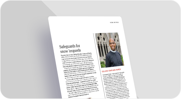 ALONG THE WALK Safeguards for snow leopards For more than 20 years, Shafqat Hussain, George and Martha Kellner Chair in South Asian Studies, has dedicated his work to protecting the snow leopard species in Northern Pakistan. In 1999, Hussain created an insurance plan that provides eco- nomic incentives to regional farmers; the insurance safeguards snow leopards, one of the world’s most endangered species, from being killed in response to an attack on a farmer’s herd. Project Snow Leopard, launched in Hussain’s home country, promotes the coexistence of humans and snow leopards. The project has three goals: to create compensation for farmers, reducing economic loss; to construct predator-proof corrals for farmers; and to monitor the snow leopard’s population through COLLEGE CHAPLAIN NAMED genetic analysis and camera trapping. In 2006, with the help of a grant provided by the Rolex The Reverend Marcus G. Halley joined the Trinity College Awards for Enterprise, Hussain—a trained economist and envi- community in August as college chaplain and dean of ronmental anthropologist—expanded the project to 10 addi- spiritual and religious life. He provides the campus tional valleys across Baltistan, impacting approximately 15,000 community with spiritual and pastoral care and counsel people. Today, the insurance plan has been adopted in India, and leads a diverse team in Spiritual and Religious Life Nepal, Bhutan, Afghanistan, and China. Through Hussain and representing Buddhism, Judaism, Protestant Christianity, his team’s work, the snow leopard population is now stable. Roman Catholicism, Islam, and interfaith communities. Halley comes to the college from the Episcopal Church in Hussain’s efforts have won numerous other awards, includ- Connecticut, where he had served since 2019 as the dean ing the United Nations Equator Prize. In 2009, he was named a of formation. In that role, he supported the formation of National Geographic Emerging Explorer. all baptized Episcopalians in Connecticut, as well as the formation of new clergy. He worked collaboratively with the Commission on Ministry to streamline and provide oversight for new and existing programs. He also served as the priest- in-charge for the Episcopal Church of the Holy Spirit, where he provided missional pastoral leadership for members of the congregation while working collaboratively with leaders within the parish to develop new models of leadership. Halley previously served as missioner for evangelism for the Episcopal Church in Minneapolis, rector at Saint Paul’s Episcopal Church on Lake of the Isles in Minneapolis, and associate priest for young adults and families at Saint Andrew’s Episcopal Church in Kansas City, Missouri. He holds a master of divinity degree from Left: Shafqat the Interdenominational Theological Center and a master Hussain, George of sacred theology degree from the School of Theology at and Martha Kellner the University of the South, where he also is completing a Chair in South doctor of ministry degree. Asian Studies Trinity President Joanne Berger-Sweeney wrote in a ↗ Inset: A pugmark MARINELLI For a video on Project Snow of a snow leopard June announcement to the community, “We, along with the Leopard and on Hussain, a Rolex search committee, were impressed by Marcus’s passion for JOHN Awards Laureate, please visit lifelong learning and his ability to build and maintain strong ) commons.trincoll.edu/Reporter. collaborative relationships with diverse populations.” GHT RI ( She added, “He will be a positive, compassionate, and : O T energizing member of the Trinity community.” PHO FALL 2021 13