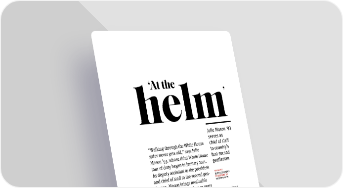 ‘At the ’ helm Julie Mason ’93 serves as “Walking through the White House chief of staff gates never gets old,” says Julie to country’s Mason ’93, whose third White House ifrst second tour of duty began in January 2021. gentleman As deputy assistant to the president and chief of staff to the second gen- STORY BY KATHY ANDREWS PORTRAITS B Y tleman, Mason brings invaluable STEPHEN VOSS experience from more than 25 years in federal and state government, political campaigns, and the business and nonproift sectors. Her chief responsibility is overseeing the contributions of the ifrst second gentleman in U.S. history, Douglas Emhoff. She appreciates the “fresh eyes” Emhoff brings to his role and is excited about helping him to deter - mine which initiatives he’ll focus on as he supports the administration and, in particular, the work of his wife, Vice President Kamala Harris. FALL 2021 17