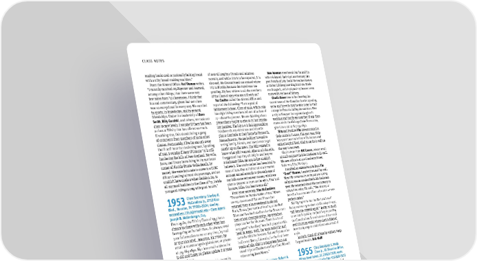 CLASS NOTES reading books and occasionally baking bread of several longtime friends and relatives Stan Newman mentioned that he and his with a nitfy bread-making machine.” recently, and while this is to be expected, it is wife celebrated their 63rd anniversary this From the Alumni Oiffce: Ted Thomas writes, also sad. We discontinued our annual winter past Fourth of July. Yeah! He teaches history “I recently received my Reporter and learned, trip to Florida because the travel was too at Osher Lifelong Learning Institute. Made among other things, that there were very grueling. My best wishes to all the members me Google it, which piqued my interest even few notes from ’52 classmates. I think that of the Class of 1953 who are still with us.” more with my love of history. is a sad commentary, given that our class Tex Coulter called the Alumni Oiffce and Charlie Bowen has to be cheering the was so exceptional in every way. We excelled reported the following: “I am a grad of recent news of the Canadian border opening, in sports, in knowledge, and in general Holderness School, Class of 1949, which only as he and his wife may be able to get to their friendships. Under the leadership of Dave has eight living members letf out of a class of cottage in Ontario during the summer. First Smith, Billy Goralski, and others, we took our 27—about 80 percent. We are thinking about a trip to Newport for a granddaughter’s class to new levels. I wonder if there has been presenting a trophy to give to its last remain- wedding and family get-together. If any class - a class at Trinity that has offered so much. ing member. The big 9-0 is fast approaching mates are in the Chicago/Lake Forest area, If nothing else, this should bring a gang this June 18; my eldest son and his wife give him a call at 847-234-2850. of comments from members of some other plan a clambake at their home in Plymouth, Skip and Pauline Pike are ensconced in classes. Fortunately, I live far enough away Massachusetts. We are looking forward to their casita in Tucson. This past year, Skip that I can’t hear the deafening roar. Speaking seeing family, friends, and loved ones to get has spent too much time with doctors and of roar, I wonder if Rory O’Connor ’50 is still caught up on the news. The kids wanted to eating hospital food. Glad to say he is well on lumbering the hills of New England. My wife, know what gitf I wanted. Atfer much thought, the way to recovery. Joan, and I have been living in the northeast I suggested that they all chip in and buy me Glad to hear from Bill Conner, whose small corner of Florida (Ponte Vedra Beach, by a stationary bike. My son-in-law couldn’t aircratf company in Erie continues to do well. name). We were fortunate to move to a CCRC believe it. The stock market has been kind to His new oiffce is at 410 Cranberry Street, (Vicars Landing) almost six years ago, and we us as of late. Our self-directed stock market Suite 110, Erie, PA 16507. couldn’t have made a wiser decision. So, to account earned enough to give each one of I received an extensive note from Tim all my good buddies in the Class of ’52, I wish our kids some retirement money, which we “Grant” Thomas, handwritten and by mail. you good tidings along with good health.” plan to present to them on the 18th. That’s all Wow! He remarked how important taking for now, folks. Our best to you all.” religion was as an elective in his freshman Class Secretary: Stanley R. From your secretary, Stan McCandless: year. He remarked about the controversy in 1953 McCandless Jr., 3712 Rice “These must be ‘hardscrabble times.’ Where education today. He said, “The history of Blvd., Houston, TX 77005-2824; stanley. are my classmates? Sal and I have just America is a constant effort to become a more [email protected] • Class Agent: returned from a long weekend in Round perfect union.” Joseph B. Wollenberger, Esq. Rock, Texas, just north of Austin, at the Dell My big regret is that the Declaration of Once again, the Trinity Class of 1953 has a Diamond baseball stadium for the Texas state Independence gets short shritf today; it says, chance to share with each other what has high school championships. My grandson “All men are created equal.” Today, so much been going on in their lives. As always, send plays catcher for his team. There is a lot of attention is paid by the judiciary to parsing your information to me at any time, by mail very good ‘schoolboy’ baseball played at this the Constitution. It reminds me of the medi- at 3712 Rice Blvd., Houston, TX 77005; by level in Texas. Well, the team took a hit and eval Christian world where clerics debated email at [email protected]; or phone came in third in the state. Sal and I plan to be how many angels could dance on a head of at 713-669-1830. My class email address list in Crested Butte, Colorado, for the ifrst three a pin. is old and fuzzy, so please update it at your weeks of July. This is a departure from our Enough; thank all of you for writing. Keep convenience. usual trips to Chatham on Cape Cod. We will in good health. Bob Wolff Jack North says he was unable to put in miss seeing Joan Moses.” his garden this year … just too much work. Class Secretary: E. Wade He sounds great and is fortunate to have his Class Secretary: Robert A. 1955 Close Jr., 65 Shoreline Drive, daughter staying with him and a grand - 1954 Wolff, 527 26th St., Santa Hilton Head Island, SC 29928-7139; wade. daughter at Trinity. Monica, CA 90402-3145; robert.wolff.1954@ [email protected]; fax: 412-820-7572 Bill Bernhard writes that he and his wife, trincoll.edu • Class Agent: Alexander J. Wow! Nineteen of our classmates reveled MP, are starting to cruise again. They’ll be Campbell II in another virtual (Zoom) gathering— on four cruises on rivers in the United States I am pleased to say that a number of our Reunion—on June 10, 2021. With a major and one in and around French Polynesia. He