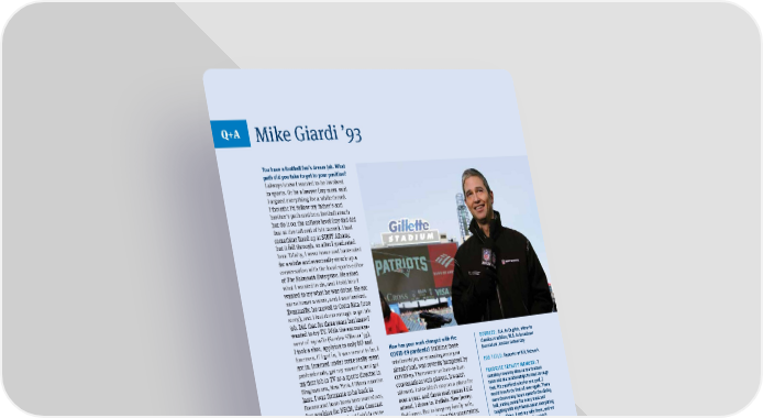 CLASS NOTES 62 THE TRINITY REPORTER Q+A You have a football fan’s dream job. What path did you take to get to your position? I always knew I wanted to be involved in sports. Or be a lawyer (my mom said I argued everything for a while there). I thought I’d follow my father’s and brother’s path and be a football coach but do it on the college level (my dad did that at the tail end of his career). I had something lined up at SUNY Albany, but it fell through, so after I graduated from Trinity, I went home and bartended for a while and eventually struck up a conversation with the local sports editor of The Falmouth Enterprise . He asked what I wanted to do, and I told him I wanted to try what he was doing. He got me 10 hours a week, and I was hooked. Eventually, he moved to Costa Rica (true story), and I had done enough to get his job. Did that for three years but knew I wanted to try TV. With the encourage- ment of my wife (Sandra Sillman ’93), I took a shot, applying to only BU and Emerson. If I got in, it was meant to be. I got in. Interned under some really great professionals, got my master’s, and got my first job in TV as a sports director in Binghamton, New York. Fifteen months later, I was fortunate to be back in Boston and have been here ever since, first working for NECN, then Comcast SportsNet New England (which even- tually became NBC Sports Boston), and finally, here at the NFL Network for the last three years. Being able to focus on one sport after two decades of covering them all is awesome. Dream come true ... 12-year-old me would have never believed this would have happened. What do you enjoy most about your work? The game. The strategy behind it. The people behind it. It’s the best reality show there is. What challenges do you face? This business is so much about building relationships. Sometimes there is a level of distrust or an effort to control the flow of that information to best protect the team or a player’s interest. Those can be difficult hurdles to overcome. How has your work changed with the COVID-19 pandemic? Building those relationships, or renewing ones you already had, was severely hampered by COVID-19. There were no face-to-face conversations with players. It wasn’t allowed. I also didn’t step on a plane for over a year, and those road games I did attend, I drove to. Buffalo. New Jersey. Baltimore. But to keep my family safe, and myself safe, during this uncertainty, that was the only way I would do it. I also managed a half dozen teams and their Zoom calls daily. I’ll admit that there were plenty of times I had a hard time keeping the times straight! How did your time at Trinity prepare you for what you do now? I wrote for the student paper at Trinity. I played football. And I learned how to handle hard deadlines and, on occasion, how to finesse people (professors) who had all the clout. Was there a professor at Trinity who was particularly influential? Professor Dirk Kuyk, who recently passed away. I prob - ably took a half dozen classes with him, and he was my adviser for my senior thesis. My roommate Justin Grigg ’93 and I used to joke that Professor Kuyk was William Faulkner. He knew that man’s material better than maybe even Faulkner himself did. He was a fascinat - ing man and was the only person who ever threw me out of a class. I hadn’t done the reading. I got what I deserved. That didn’t happen again. Much respect. Mike Giardi ’93 DEGREES: B.A. in English, minor in classical tradition; M.A. in broadcast journalism, Boston University JOB TITLE: Reporter at NFL Network FAVORITE TRINITY MEMORY: I certainly loved my time on the football team and the relationships formed through that. We sacrificed a lot for one goal. I would love to do that all over again. There were those many hours spent in the dining hall, eating cereal for every meal and laughing with my friends about everything and anything. I met my wife there, and we have two wonderful kids. I wouldn’t change that for anything.