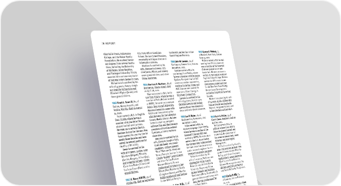 IN MEMORY Charitable Trusts, Kalamazoo U.S. Navy Oiffcer Candidate Lamberty); and brother-in-law 1966 Gunnar E. Walmet, 77, College, and the Kaiser Family School. He later joined Travelers, Daniel Kaplan (Pamela). of Rexford, New York, died on Foundation. He received honor - eventually retiring as director of June 19, 2021. ary degrees from several institu - information systems. 1966 John W. Lawson, 76, of Walmet earned a B.S. in engi- tions, including the University Mattison is survived by his Torrington, Connecticut, died on neering from Trinity, where he of Michigan, Johns Hopkins, wife, Marguerite Bowen; chil- January 15, 2021. was a member of the Brownell and Tuskegee University; Trinity dren James, Hilary, and Ashley; Lawson earned a B.A. in Club and played soccer and awarded him an honorary doctor seven grandchildren; and sister psychology from Trinity, where basketball. He went on to earn of humane letters degree in 2003. Diane Anderson. he was a member of Delta Kappa an M.S. in mechanical engineer- Richardson is survived by his Epsilon. He spent much of his ing from Union College. Walmet wife of 55 years, Nancy; daugh- 1964 Harrison H. Huntoon, 78, of career as a senior underwriter, worked for GE’s research and ters Jennifer Richardson and Barrington, Rhode Island, died working for Aetna, Cigna, and development center and later Elizabeth Vigdor (Jacob); and on April 28, 2021. ING. Lawson later owned his for the New York State Energy three grandchildren. Huntoon earned a B.A. in his- own store, Silver Lining, in Research and Development tory from Trinity, where he was a Simsbury, Connecticut. Authority, from which he retired 1962 Frank L. Sears II , 80, of member of Delta Psi and worked Lawson is survived by his in 2009. Dalton, Massachusetts, and at WRTC. He went on to earn an wife of 53 years, Harriet; sons Walmet is survived by his wife Venice, Florida, died on August M.B.A. from Cornell University. Christian Lawson and Joshua of 54 years, Linda; children Eric 31, 2020. Huntoon began his career with Lawson (Lisa); two grandchil- Walmet (Paula) and Stephanie Sears earned a B.A. in English NASA and then served as the dren; and sister Jessica Lawson. Walmet; two grandchildren; and from Trinity, where he was a administrator for the Galveston in-laws Barbara and Jack Rutt. member of Alpha Delta Phi and County Health District. He later 1966 Lee R. Nolan, 76, of played football and lacrosse. formed a start-up computer Madisonville, Tennessee, died 1968 Kevin S. McCoy, 75, of He went on to serve in the U.S. sotfware ifrm and then became on August 5, 2020. Chevy Chase, Maryland, died on Marines during the Vietnam War. president of Providence Braid Nolan earned a B.A. in April 10, 2021. Sears worked in construction for Company, a family business modern languages from Trinity, McCoy earned a B.A. in nearly three decades and later since 1904. where he was a member of the political science from Trinity, served in several positions for Huntoon is survived by his Brownell Club and QED and where he played football and the City of Pittsifeld. wife, Carolyn; daughter Sally worked at WRTC. He went on to ice hockey. He spent most of Sears is survived by his Vitali (Michael); two grand- serve in the U.S. Army during his career at Inland Steel, Carey wife of 55 years, Louise; sons daughters; siblings Howard the Vietnam War. Nolan worked Winston, and ASB Capital Matthew (Megan), Timothy “Pete” Huntoon Jr. (Ann) and for more than four decades as a Management. (Jamie), Gregory, Alfred (Joy), Nancy Forsyth; brother-in-law senior network engineer for the McCoy is survived by his wife, and Franklin (Hilary); sisters Claude “Buddy” Leach (Laura); Travelers Insurance Company. Jane; son Sean McCoy (Lee); two Carol Ann Blake (Alden) and and sister-in-law Frances Nolan is survived by his grandchildren; mother Priscilla Lucinda Croce (Dan); and 12 Watson (Robert). He was wife of 20 years, Barbara; son McCoy; and sisters Stephanie grandchildren. predeceased by sisters-in-law Christopher Nolan (Laura Keith (Albert), Laura Anderson Mixon (Paul Brabham), Gloria Pekala); stepchildren Kevin (David), and Anne Edwards 1963 E. Bruce Hill III , 79, of (Creighton Owen), and Martha Schoifeld, Raymond, Brian (Glenn). He was predeceased by Pittsburgh, died on September (Ralph Sanderson) and brother- McKee (Agnes), and Michele siblings David McCoy (Robyn) 14, 2020. in-law William Forsyth. Bordonaro (Betsy Stedman); six and Sarah McCarthy ’80 (James). Hill earned a B.A. in history grandchildren; and former wife from Trinity, where he was a 1964 Sidney R. Katz, M.D., 77, of Jean. He was predeceased by 1969 Charles P. Hill, 73, member of Delta Psi. He went on Nashua, New Hampshire, died son Todd Nolan. of London, died on February to serve in the U.S. Navy during on February 2, 2020. 20, 2021. the Vietnam War. Hill began a Katz earned a B.S. in biology 1966 Bruce W. Stavens, M.D., 76, Hill attended Trinity, where career in politics, eventually from Trinity, where he was a of Menlo Park, California, died he was a member of Delta Psi, serving as a speechwriter during member of the Brownell Club on March 6, 2021. rowed crew, and served as edi- the Nixon Administration. He and Hillel. He went on to earn Stavens earned a B.S. in tor-in-chief of The Trinity Tripod. later shitfed to the performing an M.D. from New York Medical biology from Trinity, where he He letf the college to join the arts, founding and working in College before serving in the U.S. was a member of Psi Upsilon U.S. Army and served as a para- theaters and teaching as an art - Air Force during the Vietnam and played soccer. He went on to trooper in the Vietnam War. Hill ist-in-residence at the University War. Katz practiced urology in earn a Ph.D. in physiology and returned to academia to earn of Pittsburgh. Nashua for nearly three decades biophysics from the University a bachelor’s degree in history Hill is survived by children and held several position