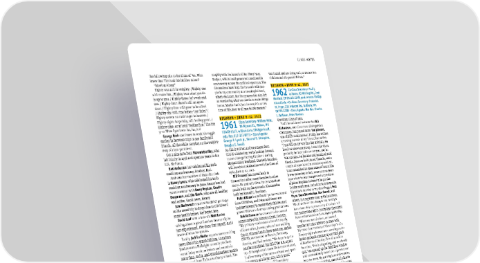 CLASS NOTES the following ode to the Class of ’60. Who roughly with the launch of the Times’ 1619 vaccinated and are doing well, as are our two knew that Tim had this hidden talent? Project, which itself generated considerable children and six grandchildren.” “Moving Along” controversy across the political spectrum. The Eighty was a little weighty; / Eighty-one discussions have kept me in touch with peo - REUNION • JUNE 9–12, 2022 a bit more fun. / Eighty-two: what you do ple in my community at a meaningful level, Co-Class Secretary: Paul J. is up to you. / Eighty-three: let’s wait and albeit via Zoom. But the process has also letf 1962 LaRocca, 82 Whiting Rd., East see. / Eighty-four: there’s still an open us wondering what we can do to make things Hartford, CT 06118-1549; paul.larocca.1962@ door. / Eighty-ifve: still great to be alive! better. Maybe that’s just the way it is at this trincoll.edu • Co-Class Secretary: Frederick / Eighty-six: still time before ‘last licks.’ / time of life. Best to all you fellow geezers.” M. Pryor, 221 Nobscot Rd., Sudbury, MA Eighty-seven: no rush to get to heaven. / 01776-3389 • Class Agents: The Rev. Charles REUNION • JUNE 9–12, 2022 Eighty-eight: hopefully, still feeling great. / L. Hoffman, Peter Meehan Eighty-nine: or at least ‘feeling ifne.’ The big Class Secretary: William Kirtz, Greetings, Class of 1962, 9–0: Wow I got here: ho, ho, ho! 1961 26 Wyman St., Waban, MA You’ll be saddened to know that Bill George Kroh continues to work his veggie 02468-1517; william.kirtz.1961@trincoll. Richardson, one of our most distinguished garden in between trips to see family and edu; fax: 617-373-8773 • Class Agents: classmates, has passed away. Tom Johnson, friends, all the while carrying on the weighty George P. Lynch Jr., Vincent R. Stempien, one of Bill’s roommates at Trinity, has written duty of class president. Douglas T. Tansill a moving memoir of our friend. Tom writes: Got a nice note from Stewart Bentley, who As this is written and we emerge from “I met Bill on my very ifrst day at Trinity. He letf Trinity in 1958 and spent 20 years in the COVID cloistering, we’re looking forward lived just above my group. I was in Jarvis 20, U.S. Air Force. to our class gathering October 2 during probably the best suite on campus, and he Bud Anderson just celebrated his 60th Homecoming Weekend. Our 60th Reunion was upstairs. We became and remained good wedding anniversary. Attaboy, Bud. will be a joint celebration with the Class of friends. Soon we both joined Theta Xi, and a And another member of that elite club 1962, June 9–12, 2022. couple of years later, he served as president. is Kenny Lyons, who celebrated his 60th Bill Cressey has moved back to I can remember his great sense of humor like wedding anniversary in June. Kenny has had Connecticut atfer many decades in other it was yesterday. In fact, some 35 or so years recent contact with Barry Royden, Charlie states. He and wife Gina live in a Madison later when he was inaugurated as president Bergmann, and Jim Gavin, who are all healthy condo built on the grounds of a mansion of Johns Hopkins University, he put the and active. Good news, Kenny. built by Russell C. Northam. Trinity contingent, including Scott Reynolds Jere Bacharach reported he didn’t get to go Peter Kilborn’s son David ’90 has recovered ’63 (who is married to my sister Peggy), Fred on his usual trip to Egypt due to COVID and from COVID-19, and Peter and Susan are Pryor, Dave Strawbridge, Don Carroll, and some health issues. Get better, Jere. looking forward to seeing their children and others, in a separate room at the luncheon. David Leof sent a note via Matt Levine grandchildren at four upcoming graduations. We all smiled at the thought that he might talking about a great London theater trip he Bob McCammon has moved to the coastal have done this to prevent any of us from tell - just experienced. I’ve done that myself, and I community of St. Simons Island, Georgia. ing stories about Bill’s Trinity days that might know of what he speaks. “My primary motive was to be with my sig - have embarrassed such an august gathering. Lastly, Jack La Mothe reports some exciting niifcant other, Jeanne, whom I met walking “When we were juniors, we roomed news about his grandchildren. Grandson the St. Simons beach three years ago. Before together as junior advisers in Jones Hall. Jordan won a Fulbright to study precious COVID, we traveled to France, Germany, My most clear memory of those days is of a metal inlay work on knives and swords in Austria, and Switzerland. “We hope to get to Sunday night when we were working on the Rajasthan, India. And granddaughter Jessica southern England this fall if the U.K. opens books and each opening up our third pack graduated from Tutfs veterinary school. You up. Although small-town life is more relaxed, of Marlboros of the day. One of us said to must be mighty proud, Jack. it offers many of the same cultural and sport - the other, ‘This is disgusting, and we should That’s all the news for now. Stay well, and ing events as a larger city. Life is good.” quit.’ We opened up the third-lfoor window stay connected. “Play squash till 100?” Legendary and ceremoniously tossed our cigarettes out From the Alumni Oiffce: Woodley Osborne Cincinnati coach and Trinity captain Don into the snow. My quitting lasted 18 months, writes, “Like all of us, I imagine, I am looking Mills ’62 has for years been working on the but on Monday morning, one could observe forward to some freedom from COVID and answer, helping organize an annual Sea Bill picking up the cigarettes out of the snow. reconnecting with family and friends old Island, Georgia, weekend most recently He went back to smoking—I don’t know for and new. We have not seen our two older derailed by COVID. The group heard Dr. Greg how long. He didn’t smoke as a mature adult. grandchildren for mor