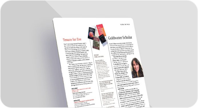 ALONG THE WALK Tenure for five Goldwater Scholar The Trinity College Board of Trustees voted in April 2021 to approve the promotions to the Trinity College neuroscience major Alicia Camuy position of associate professor with tenure of ’22 recently was selected from an estimated pool of Molly Helt in psychology and neuroscience, more than 5,000 students from across the country Peter Kyle in theater and dance, Timothy Landry to receive the Barry Goldwater Scholarship. The in anthropology and religious studies, and scholarship is among the most prestigious awards Robert Outten in psychology. The board also for students interested in pursuing careers in the voted in June to appoint Priscilla Meléndez, RECENT natural sciences, mathematics, and engineering. who previously was professor of the practice in PUBLICATIONS “[Receiving] this scholarship, language and culture studies, as full professor with tenure. Burakku Raibuzu especially as a ifrst-generation “Our newly tenured faculty represent a range of Mataa Kaisoo-roku: college student, is a huge foot liberal arts disciplines, but they are all passionate Terorisuto to Yobarete in the door for me,” said Camuy. about connecting their work to the real world Translation and notes by Rieko “It will afford me the opportu - and to their students,” said Sonia Cardenas, Wagoner, Principal Lecturer in nity to do the research I love and acting dean of the faculty and vice president for Language and Culture Studies and International Studies, Emerita help me attend a Ph.D. program academic affairs. “This is a highly accomplished, Seido-sha, Tokyo, 2021; 333 pages atfer I graduate from Trinity.” energetic group of faculty. Each of them boldly (When They Call You A Terrorist: In Camuy’s ifrst year at crosses boundaries in their scholarship, and A Black Lives Matter Memoir; all inspire engaged forms of learning in their Patrisse Khan-Cullors and asha Trinity, she took part in the students. We congratulate them on their bandele; St. Martin’s Publishing Interdisciplinary Science numerous achievements and wish them long, Group, 2017) Program (ISP), an academic distinguished careers as Trinity professors.” The Constitutional Question program for ifrst-year students to Save the Planet: The that links scientiifc disciplines MOLLY HELT People’s Right to a Healthy to their connections in the world. Through ISP, ASSOCIATE PROFESSOR OF PSYCHOLOGY AND Environment Camuy participated in research with Charles A. NEUROSCIENCE Franklin L. Kury ’58 Trinity faculty member since 2014 Environmental Law Institute, 2021; Dana Professor of Psychology and Neuroscience Ph.D., clinical psychology, University of Connecticut 224 pages Sarah Raskin. M.S., psychology, University of Connecticut In Raskin’s ReMIND Lab (Rehabilitation B.A., psychology, Smith College The New York Times’ 1619 PETER KYLE Project and the Racialist of Memory for Individuals with Neurological ASSOCIATE PROFESSOR OF THEATER AND DANCE Falsiifcation of History: Diagnoses), Camuy has been researching the Trinity faculty member since 2018 Essays and Interviews Memory for Intentions Screening Test (MIST), M.F.A., dance, University of Washington Edited by David W. Green ’71, under which evaluates prospective memory, or the ability B.A., dance and German area studies, Kenyon College the pen name David North, and Thomas Mackaman to remember to carry out a future task. “Through TIMOTHY LANDRY Mehring Books, 2021; 339 pages my research, I have discovered that the MIST ASSOCIATE PROFESSOR OF ANTHROPOLOGY AND Functional Variations assessment isn’t necessarily appropriate for all pop - RELIGIOUS STUDIES in English: Theoretical ulations, speciifcally Spanish speakers. As a result, Trinity faculty member since 2015 Ph.D., anthropology, University of Illinois at Urbana-Champaign Considerations and I applied for a Student Initiated Research Grant, ini- M.A., anthropology, University of Illinois at Urbana-Champaign Practical Challenges tiated the Institutional Review Board process, and M.A., anthropology, University of Houston Edited by Ram Ashish Giri, Anamika B.S., anthropology, University of Houston Sharma and James D’Angelo ’81 created new assessments on my own,” said Camuy. PRISCILLA MELÉNDEZ Springer, 2020; 340 pages Camuy also is a leader outside of her course- PROFESSOR OF LANGUAGE AND CULTURE STUDIES Funadaiku Nasu Seiichi work; she’s active in La Voz Latina and Trinity’s Trinity faculty member since 2012 To Nagaragawa No Ubune Multicultural Affairs Council and serves as a Ph.D., romance studies and Hispanic literature, Cornell University Wo Tsukuru (Building the ifrst-generation peer mentor, a big sister in the Big B.A., University of Puerto Rico, Río Piedras Nagara River Ubune with Sister-Little Sister program, and a student worker at ROBERT OUTTEN Boatbuilder Seiichi Nasu) Trinfo.Café. ASSOCIATE PROFESSOR OF PSYCHOLOGY Douglas Brooks ’82 Camuy is enthusiastic about continuing to Trinity faculty member since 2015 Tokyo National Research Institute for Ph.D., social psychology, Simon Fraser University Cultural Properties, 2020; 131 pages develop her research and follow her passions. M.A., social psychology, Simon Fraser University “When we are little, science is so otfen presented B.A., psychology and history, York University If you have a recent book, CD, or as facts that we already know,” said Camuy. video that you would like listed in “However, I’ve begun to learn that science is a lot ↗ The Trinity Reporter, please submit about what we don’t know. I am learning how to For more on these faculty a copy to Sonya Storch Adams, members, please visit commons. Office of Communications, Trinity be skeptical and how to explore the fascinating trincoll.edu/Reporter. College, 300 Summit Street, unknowns of the world and want to continue to do Hartford, CT 06106. Questions? so in my future.” Email [email protected]. FALL 2021 15