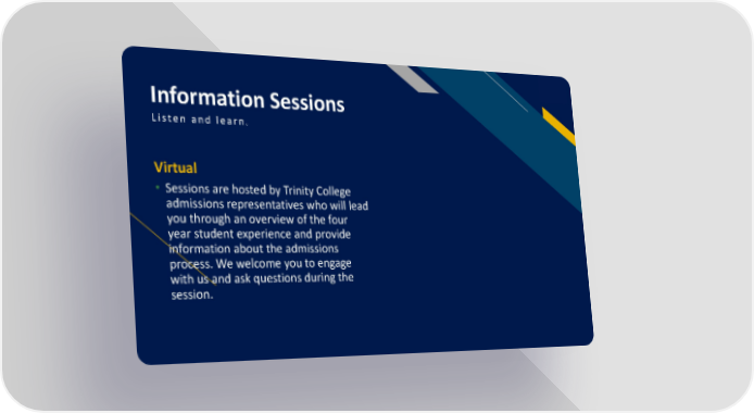 Information Sessions FR Listen and learn. Virtual • Sessions are hosted by Trinity College admissions representatives who will lead you through an overview of the four year student experience and provide information about the admissions process. We welcome you to engage with us and ask questions during the session.
