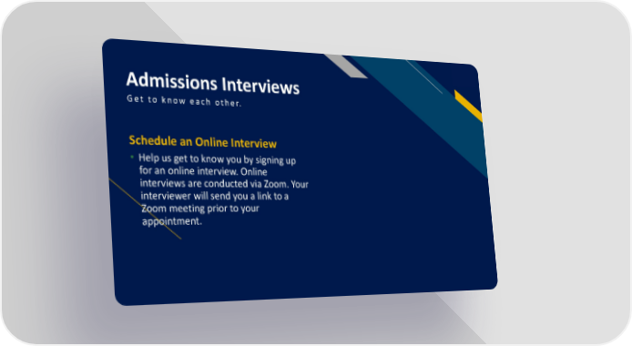 Admissions Interviews FR Get to know each other. Schedule an Online Interview • Help us get to know you by signing up for an online interview. Online interviews are conducted via Zoom. Your interviewer will send you a link to a Zoom meeting prior to your appointment.