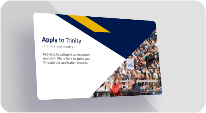 Trinity Admissions Presentation Page 7 Page 9FR Apply to Trinity Join our community. Applying to college is an important moment. We're here to guide you through the application process.