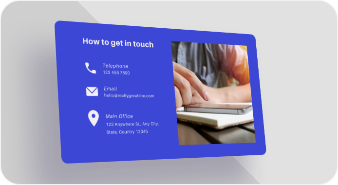 How to get in touch Telephone 123 456 7890 Email [email protected] Main Office 123 Anywhere St., Any City, State, Country 12345